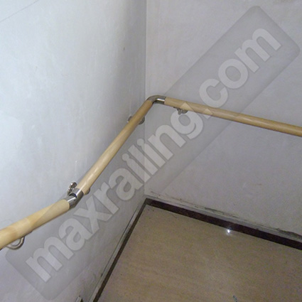 Кръгла ръкохватка по стена от дърво ясен, който е лакиран с размер Ø42мм. закрепена с иноксови държачи. Ръкохватките са свързани с иноксови елементи.