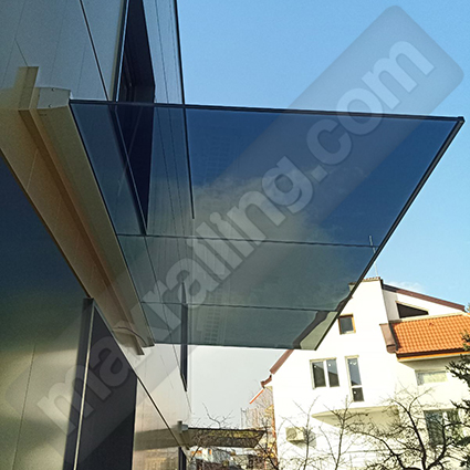 Стъклен навес: елоксиран алуминиев прифил със система за монтаж на стъклото. Всяко едно стъкло се състои от едно сиво и едно безцветно закалени стъкла на френската фирма „Saint-Gobain“, с дебелина по 10мм. ламинирани с четири фолиа модел „EVA Premium” (състав етил винил ацетат) с висока устойчивост на влага, атмосферни условия и стареене. В предния край на стъклото се поставя профил от сатенирана неръждаема стомана AISI 304.