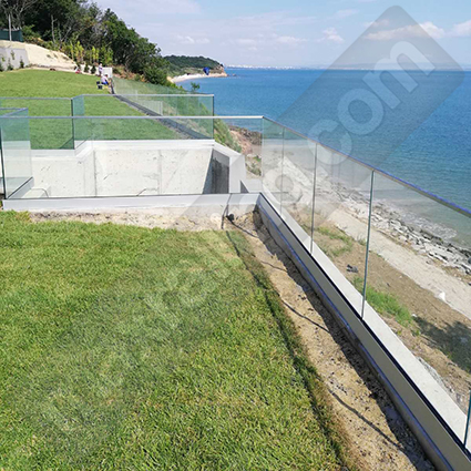 Стъклен парапет: Основа плътен елоксиран алуминиев прифил със система за монтаж на стъклото. Профила се монтира към стоманобетонната конструкция чрез химически анкер „Hilti” и крепежни елементи от неръждаема стомана. Всяко стъкло се състои от две безцветни закалени стъкла на френската фирма „Saint-Gobain“, с дебелина по 8мм. ламинирани с две фолиа модел „EVA Premium” (състав етил винил ацетат) с висока устойчивост на влага, атмосферни условия и стареене. Ръкохватка от П-профил 20х20х1,5мм. от неръждаема стомана AISI 304. Височина на парапета 105см. измерено от готов под.