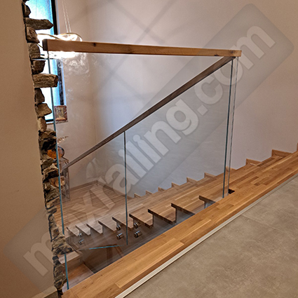 Стъклен парапет: Всяко стъкло се състои от две безцветни закалени стъкла на френската фирма „Saint-Gobain“, с дебелина по 8мм. ламинирани с две фолиа модел „EVA Premium” (състав етил винил ацетат) с висока устойчивост на влага, атмосферни условия и стареене. Стъклото се захваща към конструкцията с иноксови дистанционери Ø50мм. Лакирана дървена ръкохватка от дъб 40х40мм. с канал за закрепване върху стъклото. Височина на парапета 90см. измерено от преден край на стъпалото.